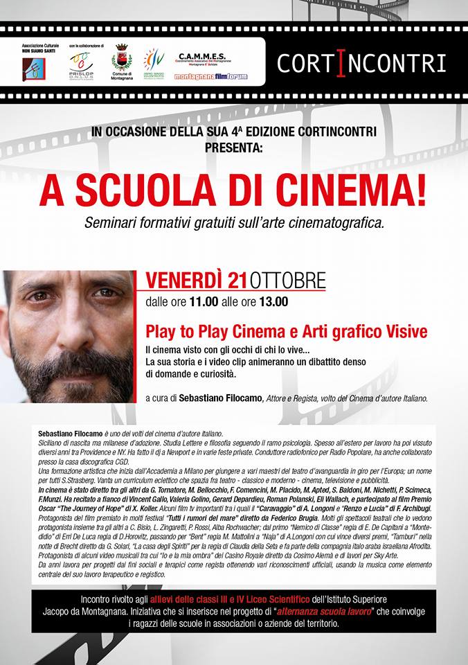 Venerdì 21/10/2016 la mattina dalle ore 11.00 presso l'istituto Superiore Jacopo da Montagnana e nel pomeriggio dalle ore 14.15 presso la Ex Chiesa San Benedetto di Montagnana, Sebastiano Filocamo presenta play to play lezioni di cinema